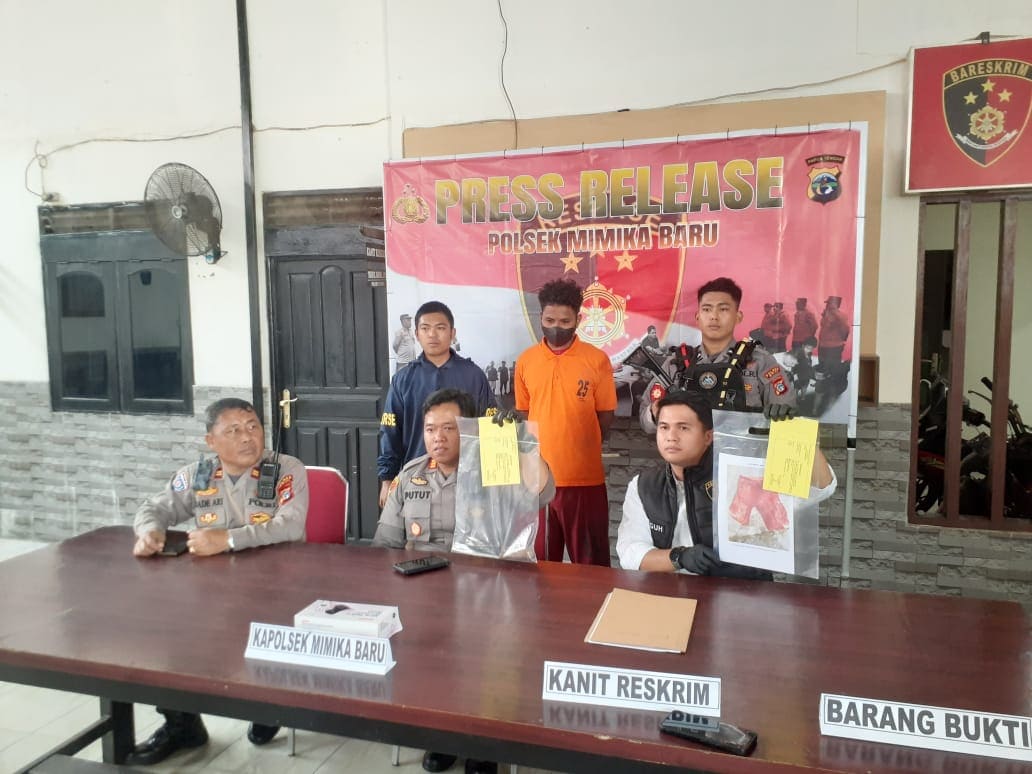 “Pada Minggu, 21 September 2025, sekitar pukul 06.30 WIT Polsek Mimika Baru menerima laporan kasus penikaman. Tim Opsnal segera bergerak ke TKP, mengumpulkan keterangan saksi, dan mendapat informasi pelaku telah melarikan diri. Sekitar pukul 07.15 WIT, pelaku  ditangkap di depan rumahnya di Kompleks Biak–Timika dan langsung dibawa ke Polsek untuk diperiksa,”katanya.