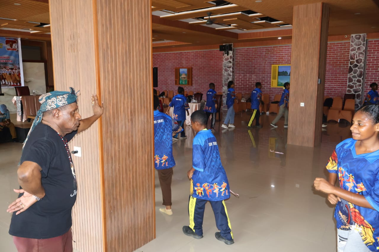 Praktisi budaya Kamoro yang juga sebagai Instruktur dari kegiatan tersebut,Yohanis Kapiyau saat memantau latihan peserta tari tradisional di gedung hotel Cartenz pada Jumat (21/11). Foto: Brayen/TelukPapua.Com