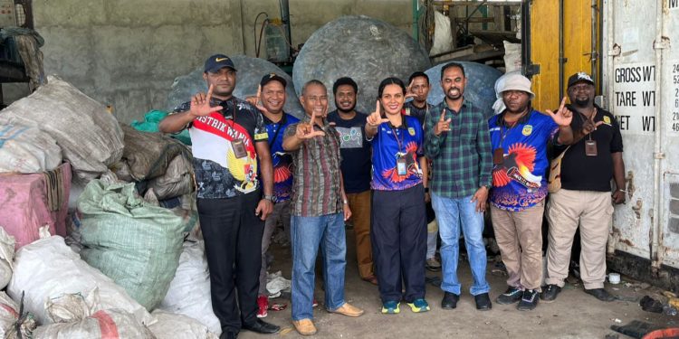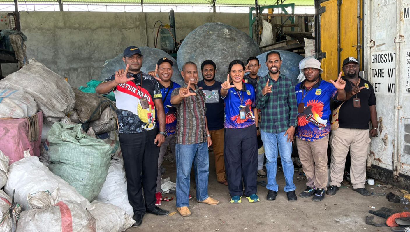 Kepala Distrik Wania, Merlyn Temorubun, S.STP, pemilik Bank Sampah Induk Timika, H. Ilham dan Ketua Umum APKM, Yosep Temorubun, S.H serta sejumlah staf Distrik Wania melakukan kegiatan Jumat Bersih atau Clean Friday dengan mengunjungi lokasi pusat bank sampah milik H.Ilham di Timika, pada Jumat 26 September 2025.