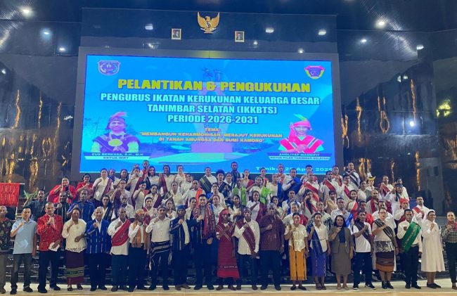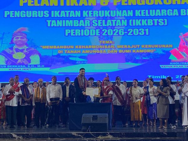 TIMIKA, TelukPapua.com – Ketua Ikatan Kerukunan Kepulauan Tanimbar (IKKT) Kabupaten Mimika, Eus Berkasa, S.H.,M.H secara resmi melantik Pengurus Pilar Kecamatan Tanimbar Selatan (Tansel) Periode 2026-2031 di Gedung Eme Neme Yaware Timika, Sabtu 25 April 2026. Sedangkan doa pengukuhan dipimpin oleh Diakon Bobby Arwalembun, OSA dan Pendeta R.Poceratu, S.Si.