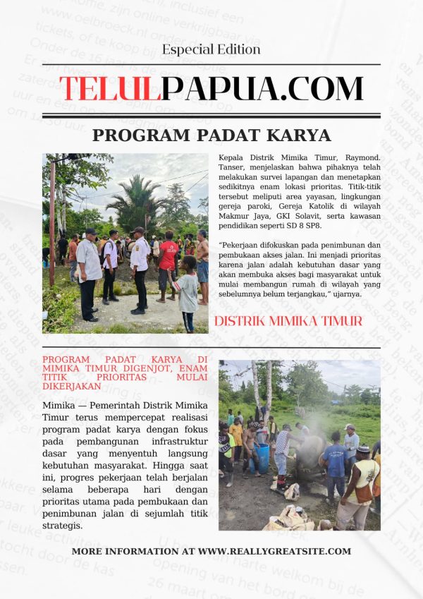 TIMIKA, TelukPapua.com — Pemerintah Distrik Mimika Timur terus mempercepat realisasi program padat karya dengan fokus pada pembangunan infrastruktur dasar yang menyentuh langsung kebutuhan masyarakat. Hingga saat ini, progres pekerjaan telah berjalan selama beberapa hari dengan prioritas utama pada pembukaan dan penimbunan jalan di sejumlah titik strategis.