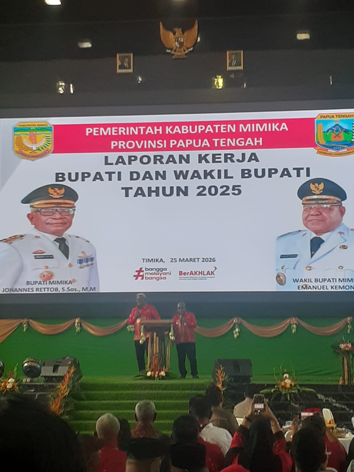 “Saya dan Wakil Bupati hari ini ingin menyampaikan apa yang kami mulai dari Maret 2024 sampai akhir Desember 2025 bahkan sampai saat ini tahun 2026,”ujar Bupati Mimika Johanes Rettob.